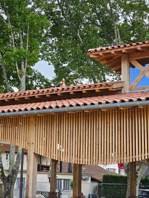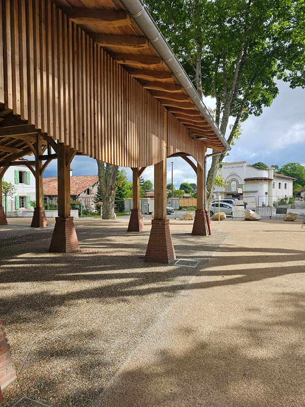 Cette halle a pour objectif d’être polyvalente et de servir les usages sociaux des habitants de la commune, en étant le support de rencon- tres festives ou quotidiennes. Les éléments présents sur la place (ar- bres répertoriés) sont conservés afin de ne pas transformer brutale- ment le lieu. La halle sera un atoût sur cette place sans mettre dans l’ombre les bâtiments remarquables de la commune présents sur le site tels que la bibliothèque, la salle des fêtes, le relais touristique.