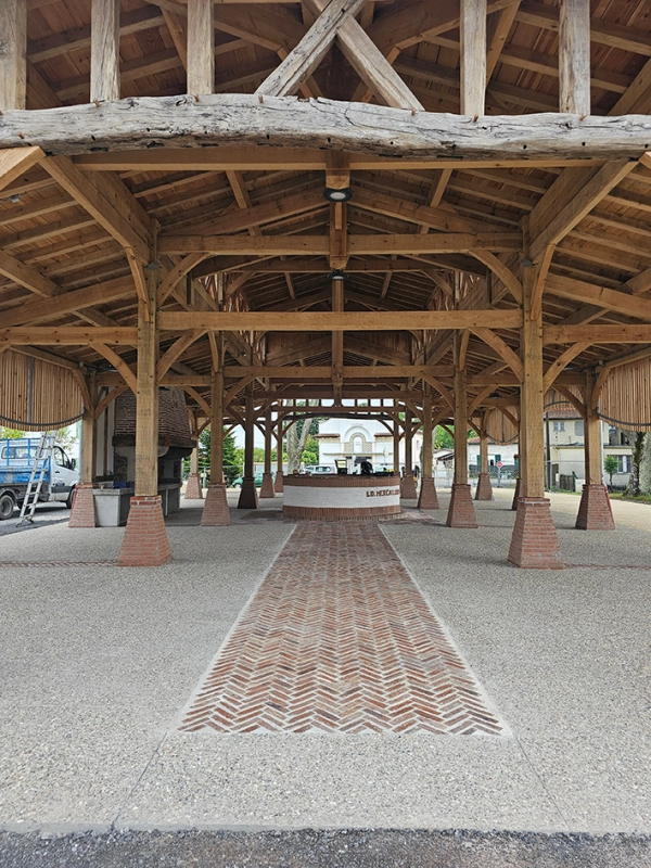 Une structure unique est créée au centre de la halle, au niveau du sol, permettant à ce lieu d’être polyvalent avec un socle qui sert à la fois de socle pour des représentations ou bien d’assise au quoti- dien. L’absence d’obstacles, de marches ou de ressauts permet de recevoir tout type de public, y compris les personnes à mobilité réduite. La mise en oeuvre de ce bâtiment relate le savoir-faire des charpentiers de la région, avec un noeud de charpente exception- nel. Un barbecue est prévu sur la façade Ouest afin de profiter de repas collectifs.